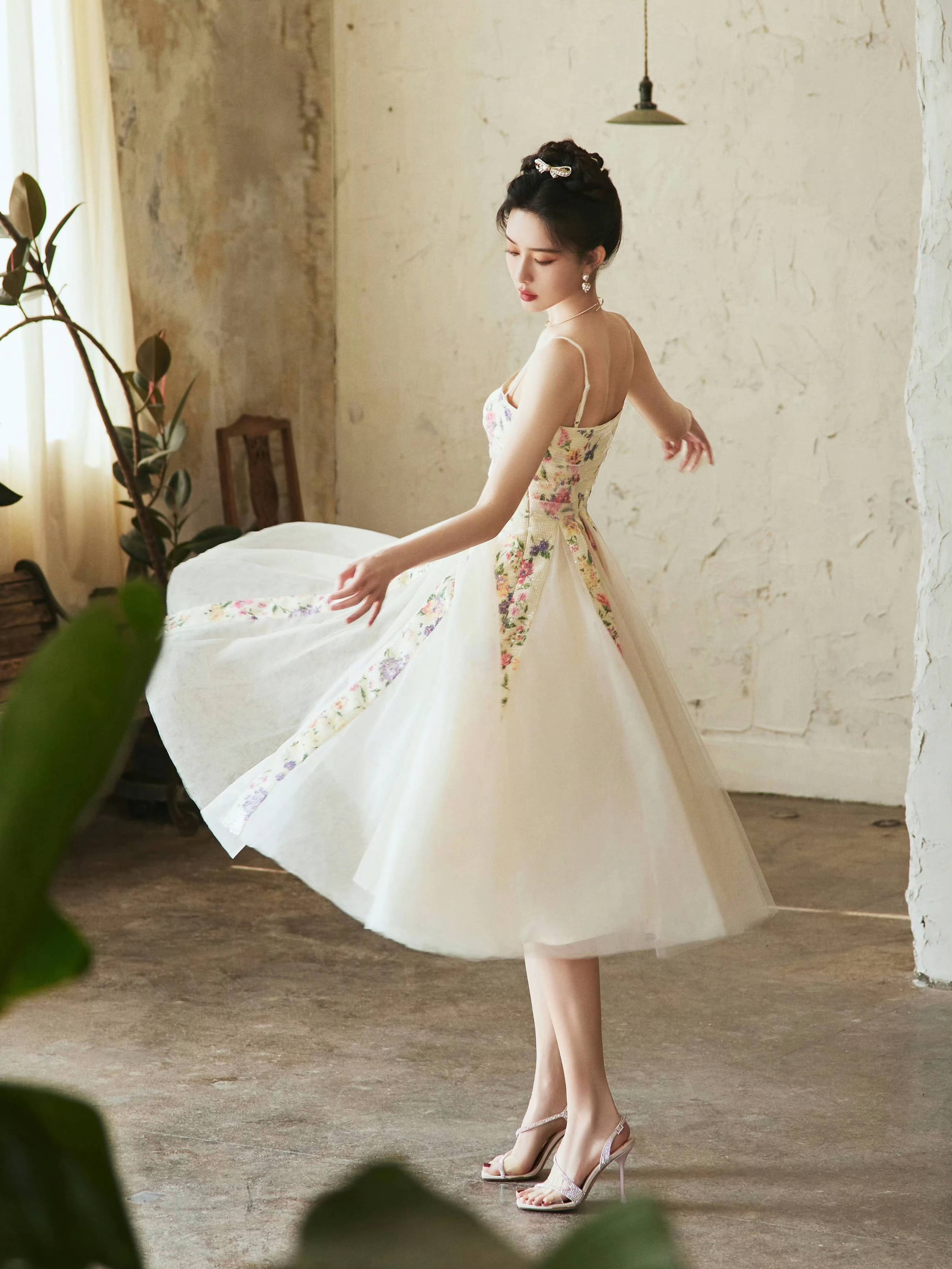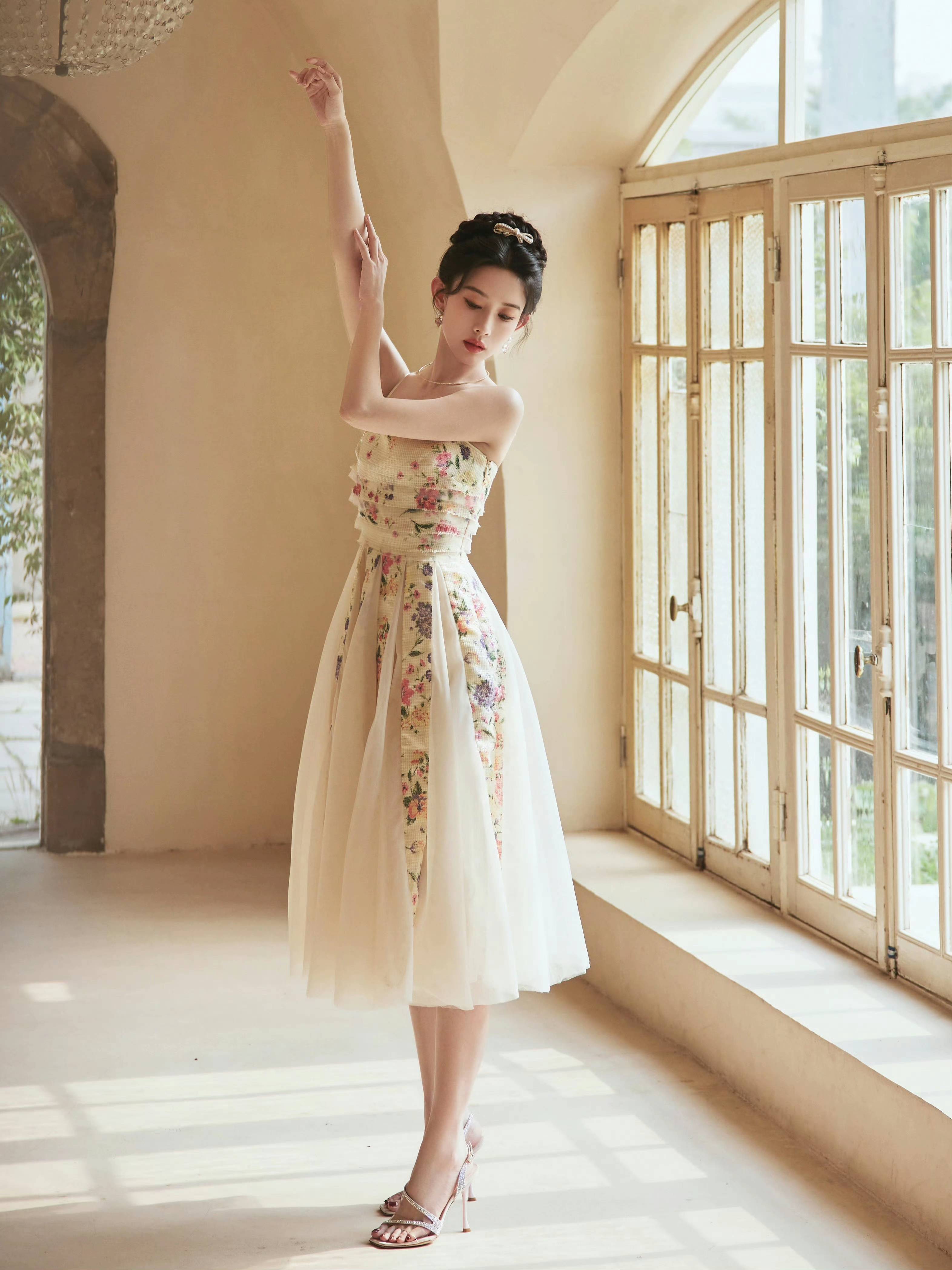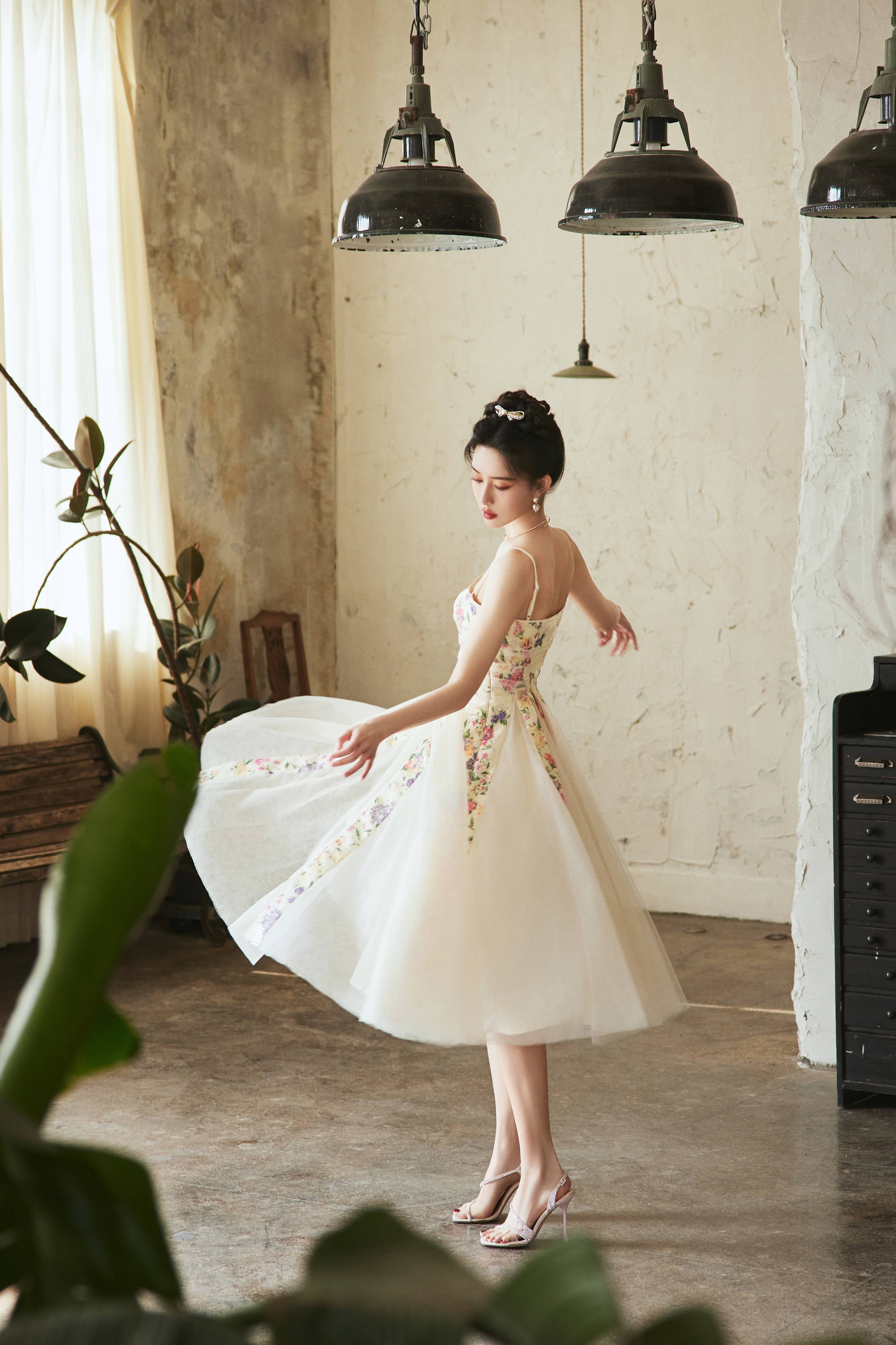 立体花簇的浪漫撞上网纱裙摆的空灵,搭配珍珠发饰与水钻高跟鞋,在复古场景的烘托下,将宴会穿搭的精致感与法式风格的浪漫感揉得如梦似幻。每一次转身,都是时尚与艺术交融的唯美瞬间。